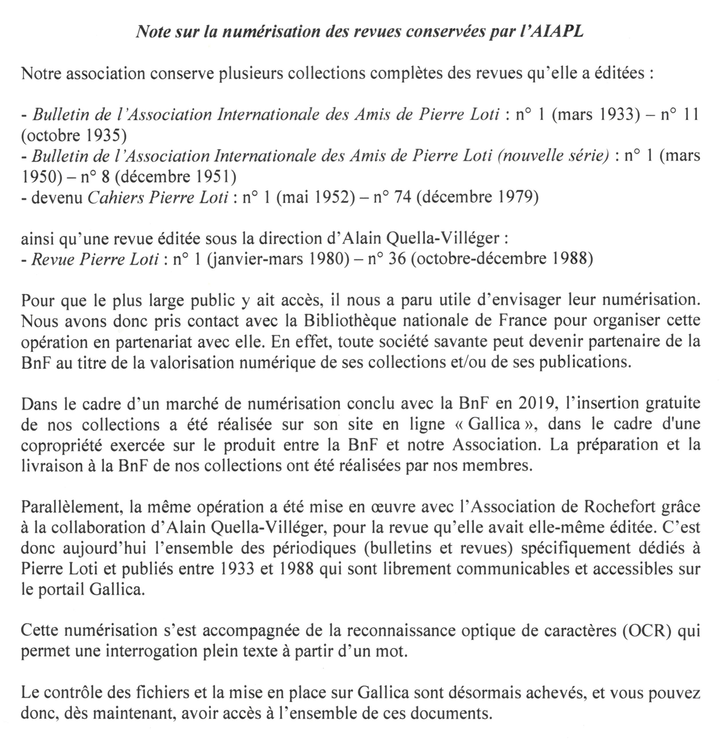 Partenariat entre la BnF et l’AIAPL – Les bulletins de l’Association : c.bnf.fr/MJK – Les Cahiers Pierre Loti : c.bnf.fr/MJN – La Revue Pierre Loti : c.bnf.fr/MJH ——————– Bibliothèque Nationale de France, 613 ressources : https://data.bnf.fr/11913405/pierre_loti/ Posted on 10 février 2021 by AIAPL