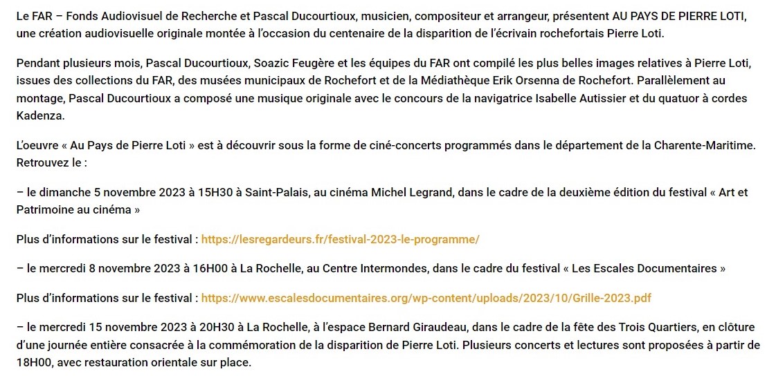Fond Audiovisuel de Recherche : Au Pays de Pierre Loti https://far-asso.fr/au-pays-de-pierre-loti/ Posted on 24 juillet 2023 by AIAPL