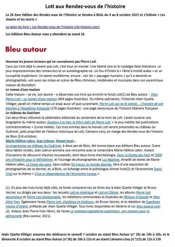 Loti aux Rendez-vous de l’histoire, Blois du 4 au 8 octobre 2023 Le salon du livre | Les Rendez-vous de l’histoire (rdv-histoire.com) Posted on 5 septembre 2023 by AIAPL