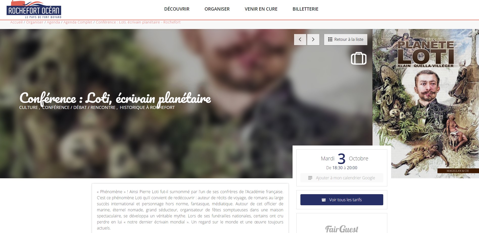 Conférence : Loti, écrivain planétaire le 3 octobre 2023 à la médiathèque de Rochefort – Corderie Royale https://www.rochefort-ocean.com/organiser/agenda/agenda-complet/conference-loti-ecrivain-planetaire-4415293 Posted on 10 septembre 2023 by AIAPL