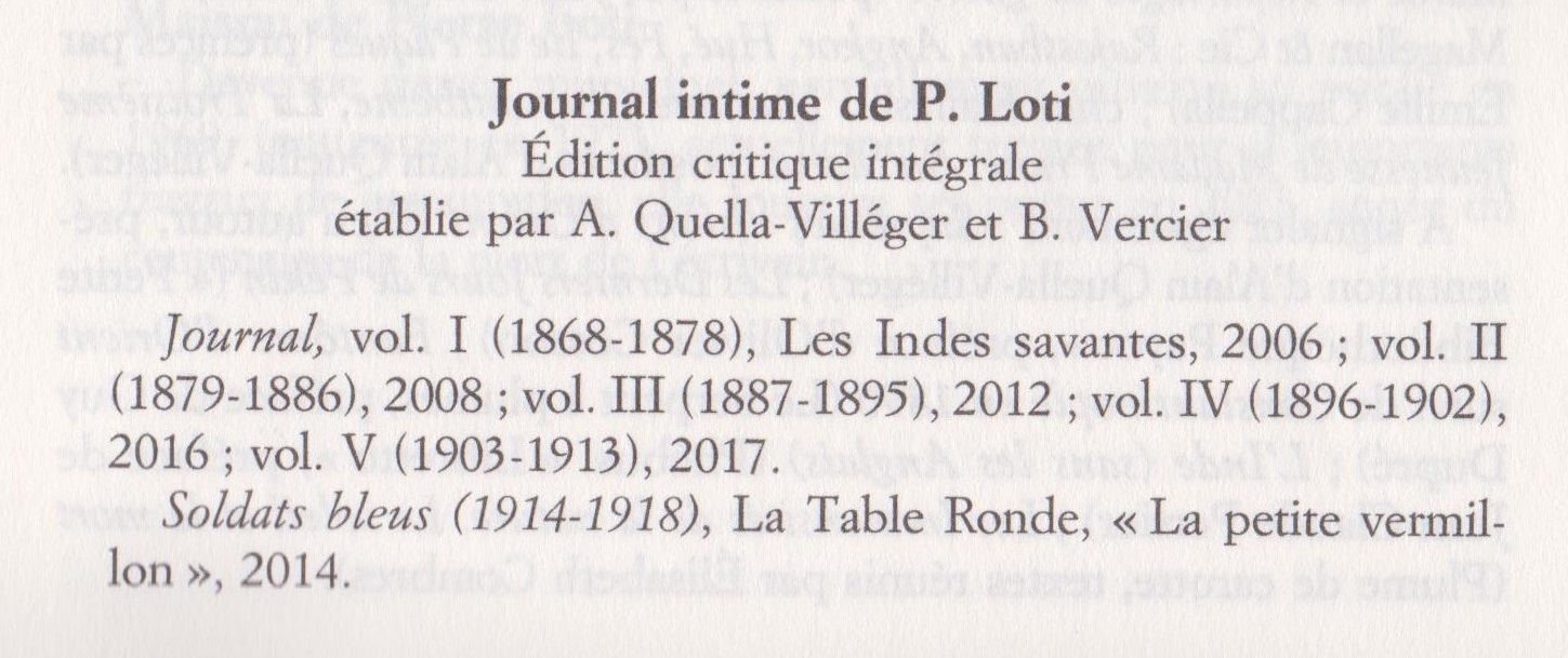 Quella-Villéger (Alain) et Vercier (Bruno), Journal de Pierre Loti en 5 tomes, de1868 à 1913, Rivages des Xantons, Les Indes Savantes, de 2006 à 2017, Prix de l’Académie française 2018 (prix Emile Faguet). (Cliquez sur la phrase pour découvrir les volumes).