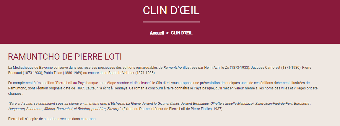La Médiathèque de Bayonne conserve dans ses réserves précieuses des éditions remarquables de Ramuntcho… Posted on 26 juin 2021 by AIAPL https://mediatheque.bayonne.fr/iguana/www.main.cls?p=6d96bc91-7382-4e7b-8f18-f40562b734fd&v=d3b8935c-7693-42bd-99a1-de79b3e9db3f#contentitem=fb12c5be-f634-4f59-966a-ba322351a269^2