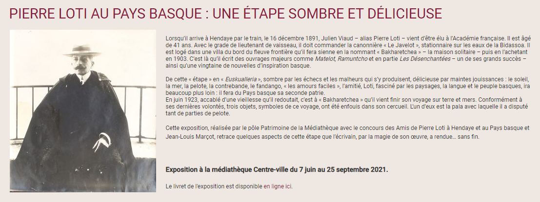 Le livret de l’exposition : PIERRE LOTI AU PAYS BASQUE : UNE ÉTAPE SOMBRE ET DÉLICIEUSE Posted on 26 juin 2021 by AIAPL Cliquez : Livret LOTI au pays basque https://mediatheque.bayonne.fr/iguana/www.main.cls?p=6d96bc91-7382-4e7b-8f18-f40562b734fd&v=e11462fe-84fb-42dc-817f-5a790b676dfa#contentitem=1a5c56ca-68cb-406b-ae3c-2acb759f6522^2