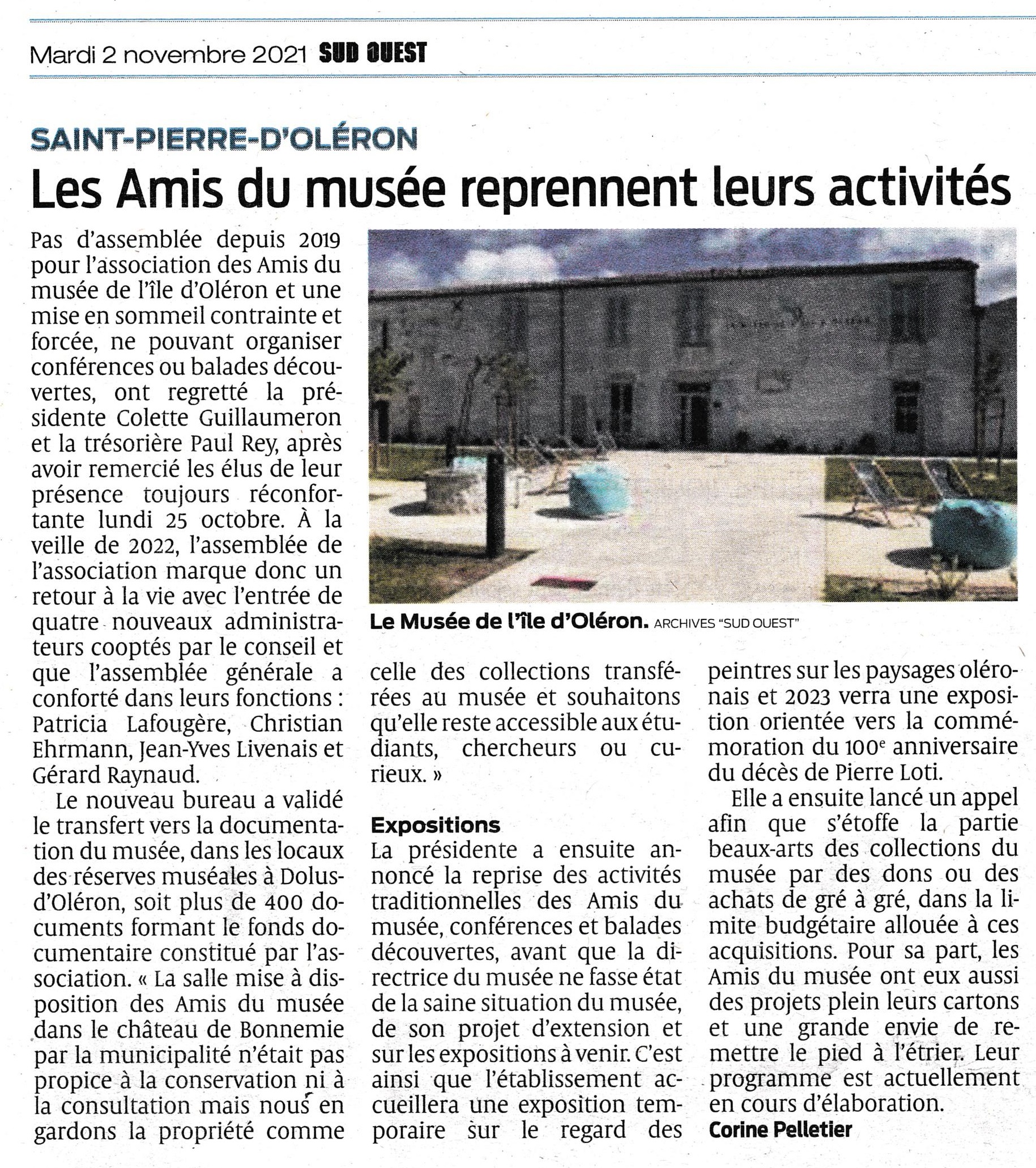 Saint-Pierre-d’Oléron : Les Amis du musée reprennent leurs activités Posted on 2 novembre 2021 by AIAPL Article transmis par Christian Ehrmann