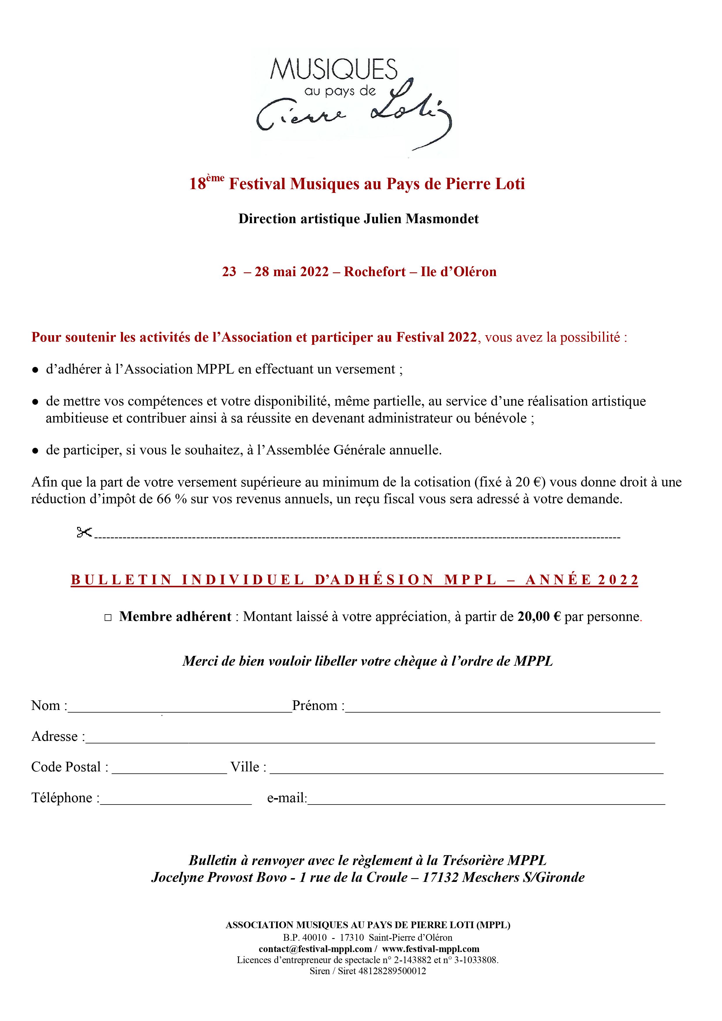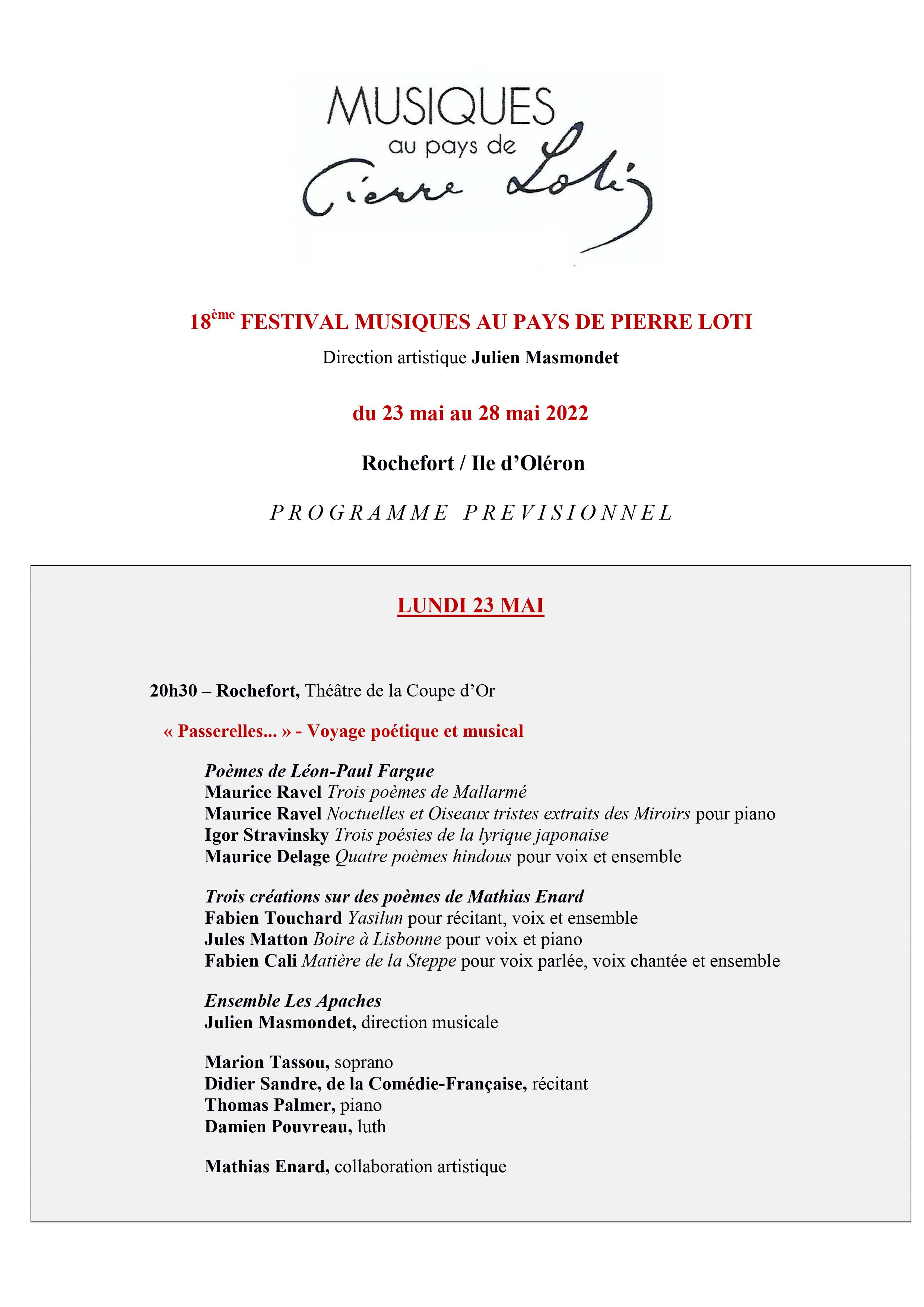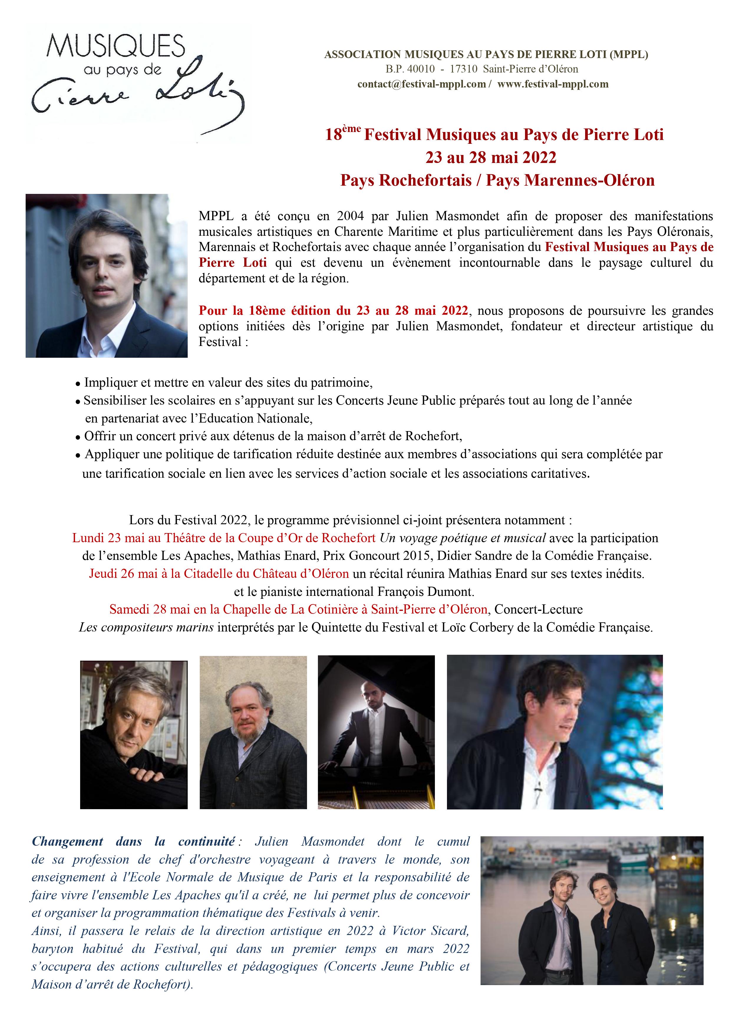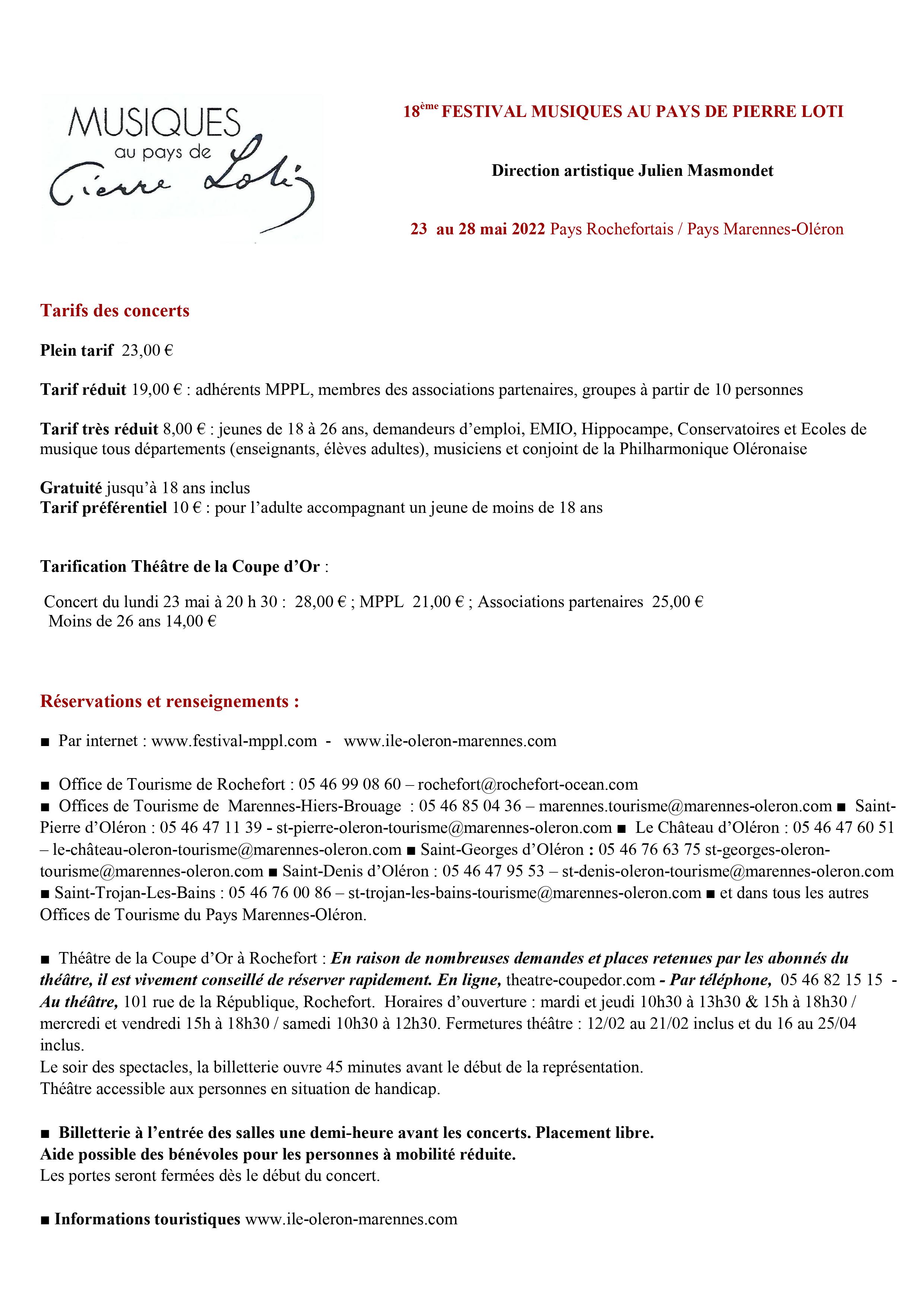 18ème Festival Musiques au Pays de Pierre Loti du 23 au 28 mai 2022 Posted on 2 novembre 2021 by AIAPL