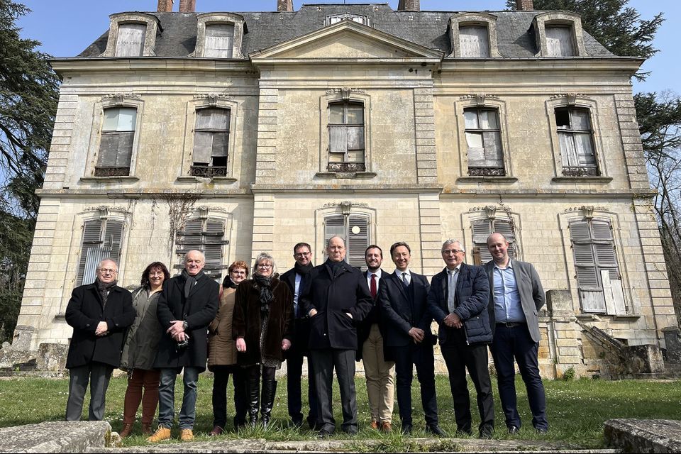 Le prince Albert et les membres de l’Association des Sites historiques Grimaldi de Monaco, à Cherré-Au, devant le château de Haut-Buisson © DR