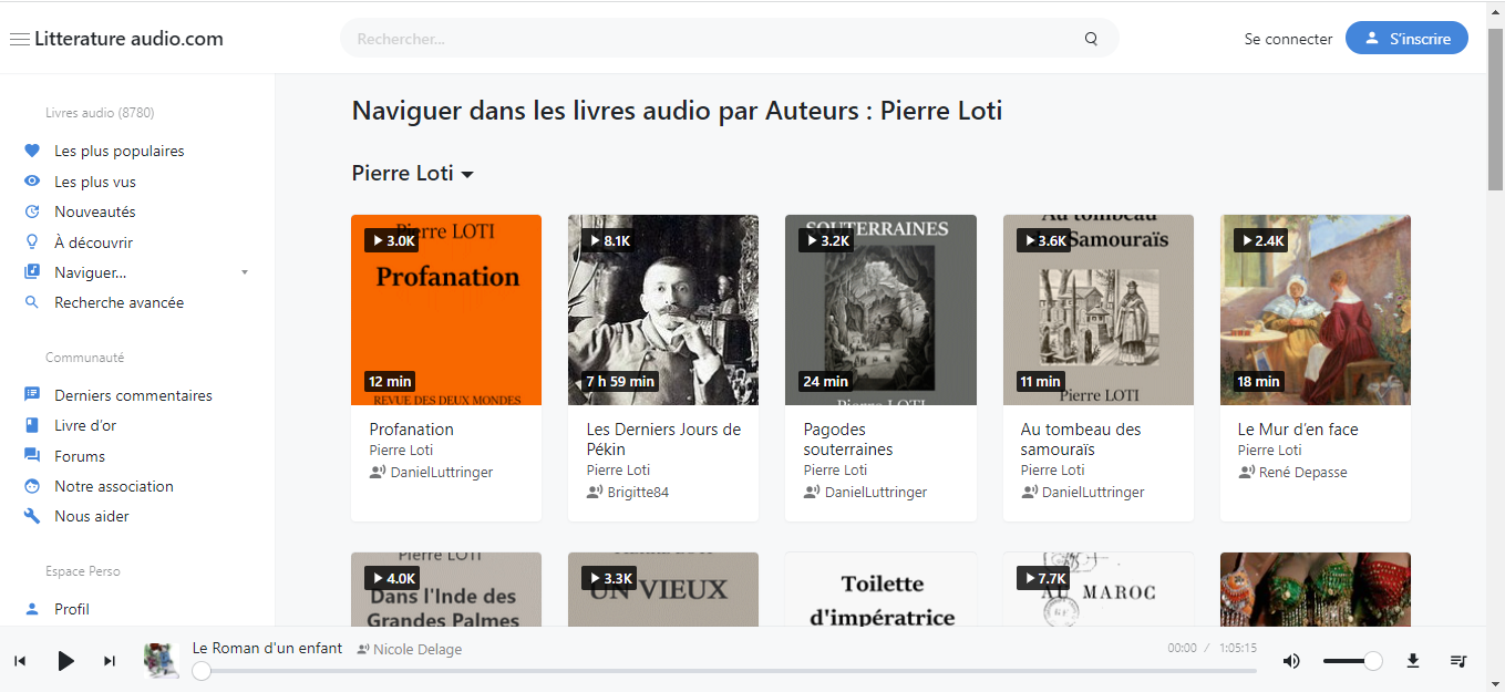 Naviguer dans les livres audio par Auteurs : Pierre Loti Posted on 27 mars 2022 by AIAPL Cliquez sur le lien suivant pour accéder aux livres audio : https://www.litteratureaudio.com/livre-audio-gratuit-mp3/auteur/pierre-loti
