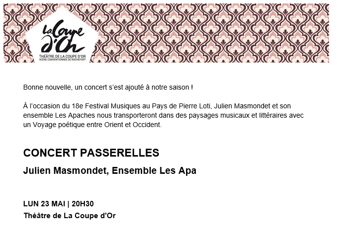Concert Passerelles – Musiques au Pays de Pierre Loti à La Coupe d’Or Posted on 4 novembre 2021 by AIAPL https://www.festival-mppl.com/