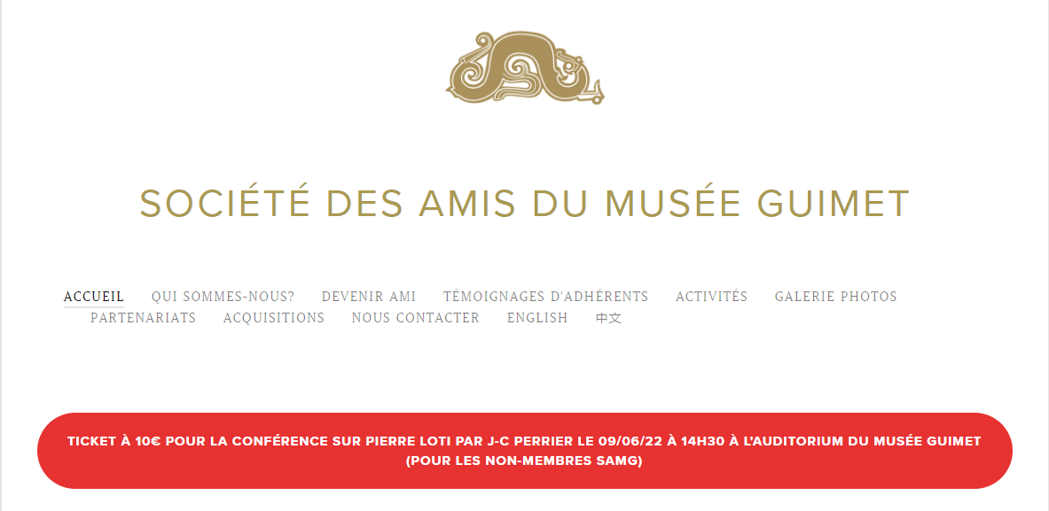 Conférence sur Pierre Loti par J.C. Perrier le 9 juin 2022 à l’auditorium du musée Guimet Posted on 20 octobre 2021 by AIAPL https://www.amisdeguimet.com/