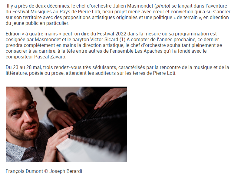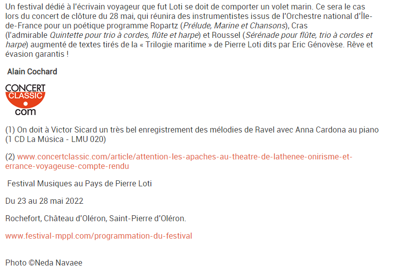 18ÈME FESTIVAL MUSIQUES AU PAYS DE PIERRE LOTI — LA MUSIQUE ET LA MER Posted on 2 février 2022 by AIAPL https://www.concertclassic.com/article/18eme-festival-musiques-au-pays-de-pierre-loti-la-musique-et-la-mer