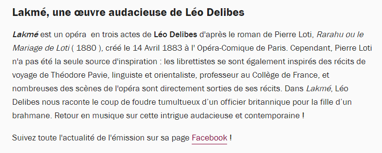 Lakmé de Léo Delibes, mais où va la jeune Hindoue ? Posted on 9 septembre 2022 by AIAPL Ecoutez en cliquant : https://www.radiofrance.fr/francemusique/podcasts/musicopolis/lakme-de-leo-delibes-mais-ou-va-la-jeune-hindoue-5241331