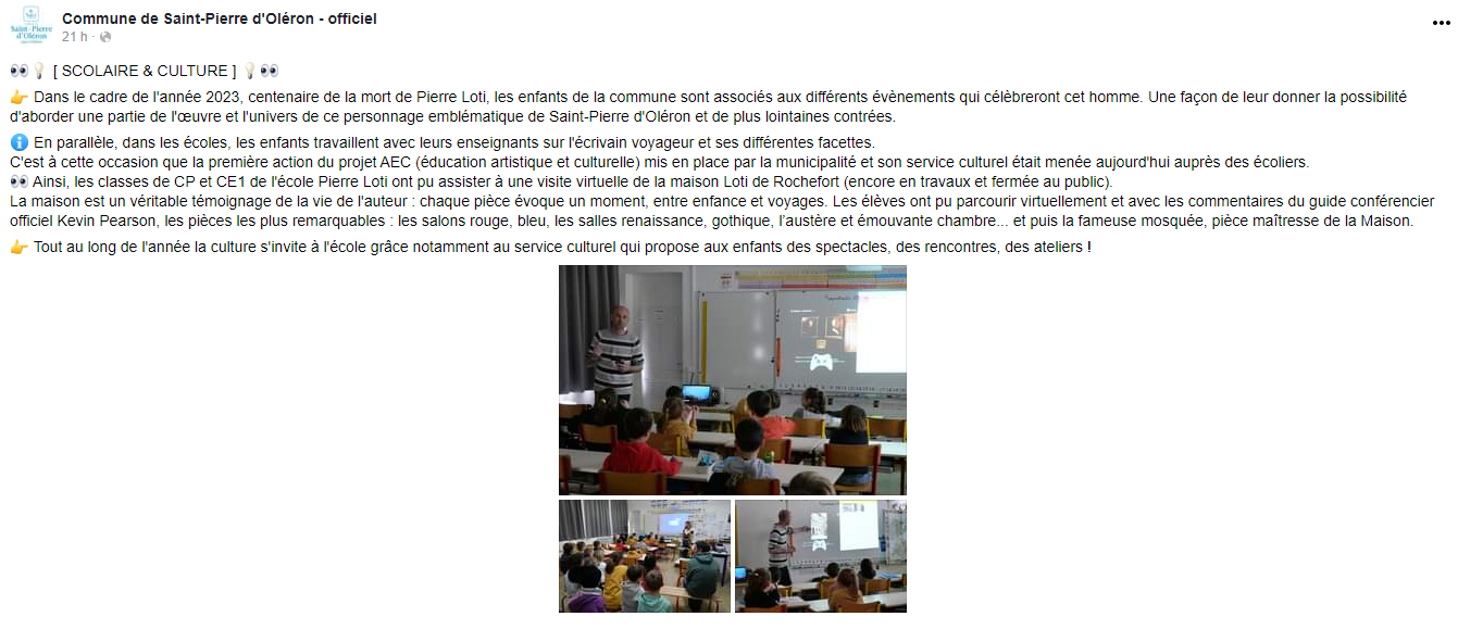 Les enfants de Saint-Pierre d’Oléron associés aux évènements dédiés au centenaire de la mort de Pierre Loti Posted on 26 novembre 2022 by AIAPL https://m.facebook.com/story.php?story_fbid=pfbid0a9UrkrVPZgw1uXf9jEFAMLgYPWhFpQtTdCRimnVgsr1TyxK4bA5b8jSQKc5au2NUl&id=100063651625820