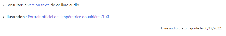 L’impératrice Printemps Posted on 8 décembre 2022 by AIAPL Cliquez sur ce lien : https://www.litteratureaudio.com/livre-audio-gratuit-mp3/pierre-loti-limperatrice-printemps.html