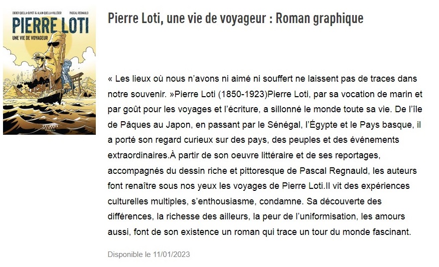 Pierre Loti, une vie de voyageur : Roman graphique Posted on 16 décembre 2022 by AIAPL https://www.izneo.com/fr/roman-graphique/documentaire/pierre-loti-une-vie-de-voyageur-roman-graphique-53997