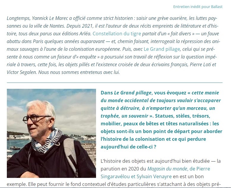 Histoire, littérature et enquêtes : une discussion avec Yannick Le Marec Posted on 16 décembre 2022 by AIAPL Poursuivre la lecture de cet article en cliquant sur ce lien : https://www.revue-ballast.fr/histoire-litterature-et-enquetes-une-discussion-avec-yannick-le-marec/