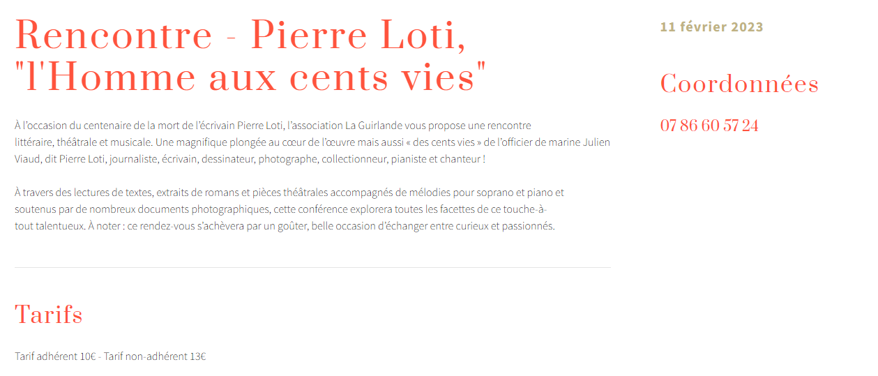 Rencontre – Pierre Loti, « l’Homme aux cents vies », 11 février 2023 Posted on 29 août 2022 by AIAPL https://www.vincennes-tourisme.fr/fiche/rencontre-pierre-loti-l-homme-aux-cents-vies/