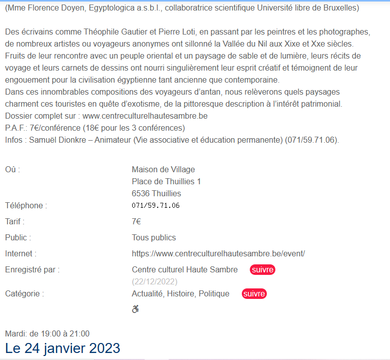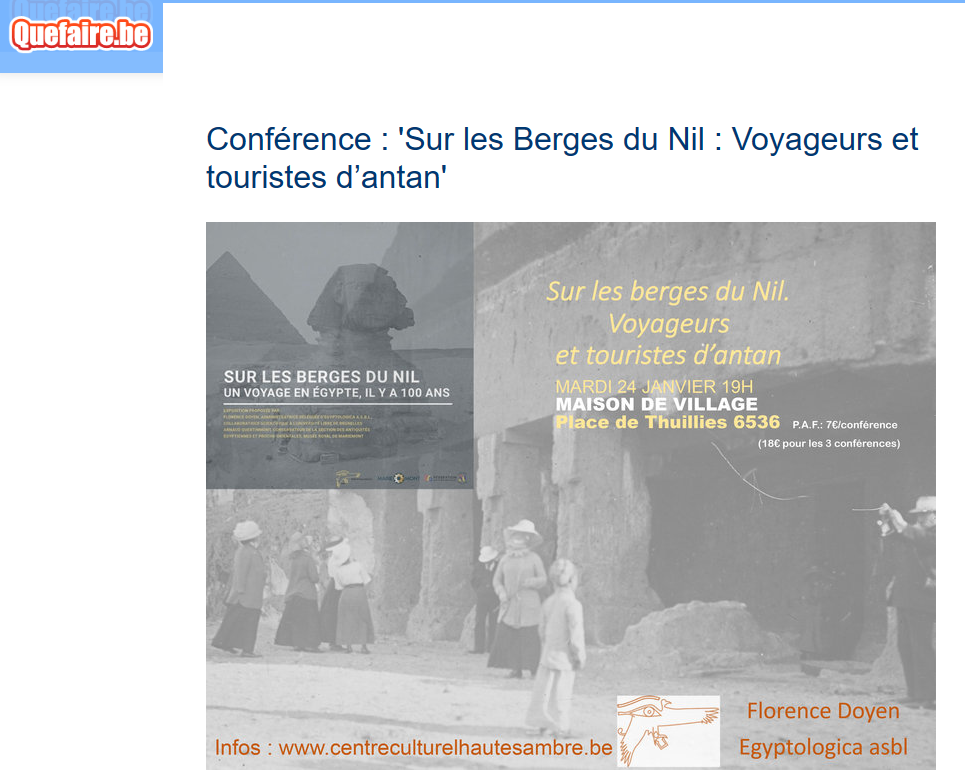 Conférence : « Sur les berges du Nil : Voyageurs et touristes d’antan », 24 janvier 2023 Posted on 5 septembre 2022 by AIAPL Conférences Actualité, Histoire, Politique: Conférence : ‘Sur les Berges du Nil : Voyageurs et touristes d’antan’ – Thuillies (Hainaut) (quefaire.be)