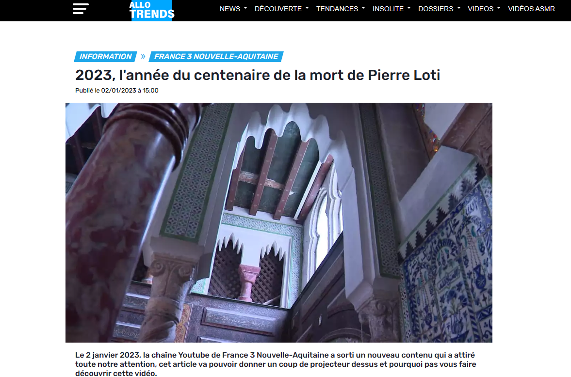 2023, l’année du centenaire de la mort de Pierre Loti Posted on 4 janvier 2023 by AIAPL Cliquez : https://youtu.be/Ied1JJV4-vk https://www.allotrends.com/fr/france-3-nouvelle-aquitaine/2023-l-annee-du-centenaire-de-la-mort-de-pierre-loti-1076819.html