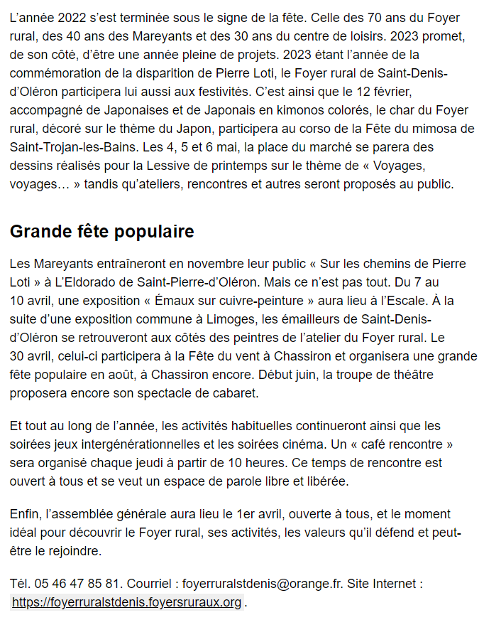 « Sur les chemins de Pierre Loti » à l’Eldorado de Saint-Pierre-d’Oléron Posted on 28 janvier 2023 by AIAPL https://www.sudouest.fr/charente-maritime/saint-denis-d-oleron/saint-denis-d-oleron-70-ans-et-des-projets-plein-la-tete-13825097.php
