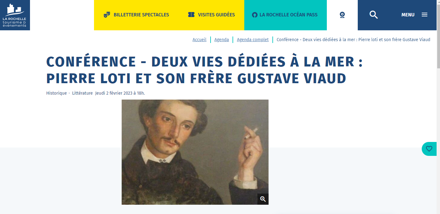 Conférence – deux vies dédiées à la mer : Pierre Loti et son frère Gustave, le 2 février 2023 à La Rochelle Posted on 31 janvier 2023 by AIAPL https://www.larochelle-tourisme.com/agenda/agenda-complet/conference-deux-vies-dediees-a-la-mer-pierre-loti-et-son-frere-gustave-viaud