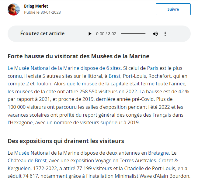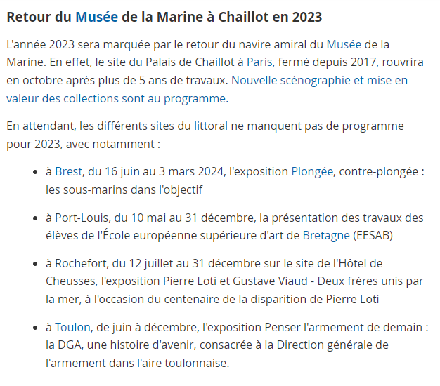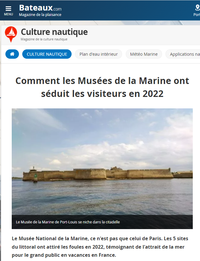 Comment les Musées de la Marine ont séduit les visiteurs en 2022 Posted on 31 janvier 2023 by AIAPL https://www.bateaux.com/article/42306/comment-les-musees-de-la-marine-ont-seduit-les-visiteurs-en-2022