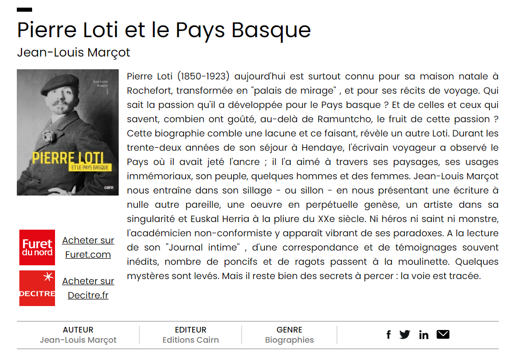 « Pierre Loti et le Pays Basque », auteur Jean-Louis Marçot, éditions Cairn Posted on 14 février 2023 by AIAPL https://actualitte.com/livres/1508945/pierre-loti-et-le-pays-basque-jean-louis-marcot-9791070061695