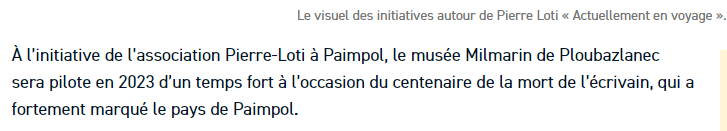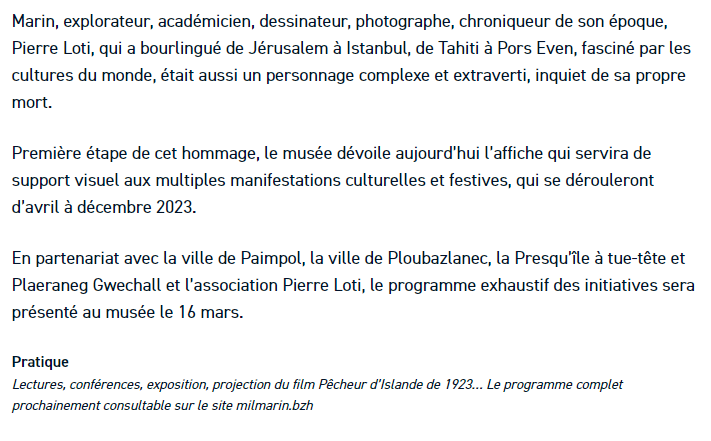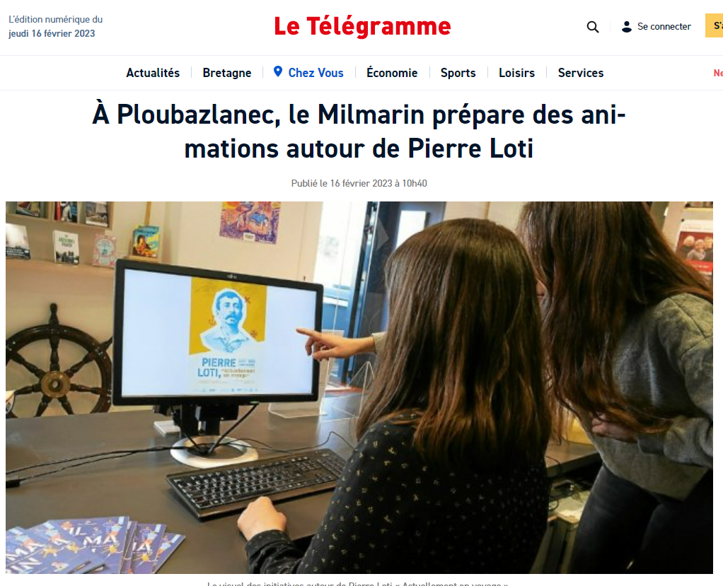 A Ploubazlanec, le Milmarin prépare des animations autour de Pierre Loti Posted on 16 février 2023 by AIAPL https://www.letelegramme.fr/cotes-darmor/ploubazlanec/a-ploubazlanec-le-milmarin-prepare-des-animations-autour-de-pierre-loti-16-02-2023-13280337.php