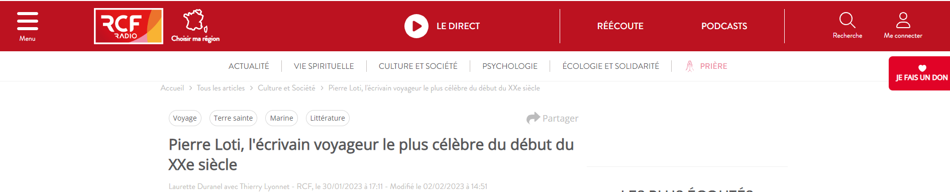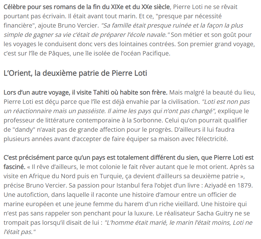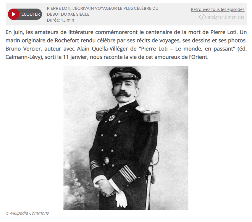 Pierre Loti, l’écrivain voyageur le plus célèbre du début du XXe siècle Posted on 23 février 2023 by AIAPL https://www.rcf.fr/articles/culture-et-societe/pierre-loti-marin-amoureux-des-voyages-et-auteur-oublie