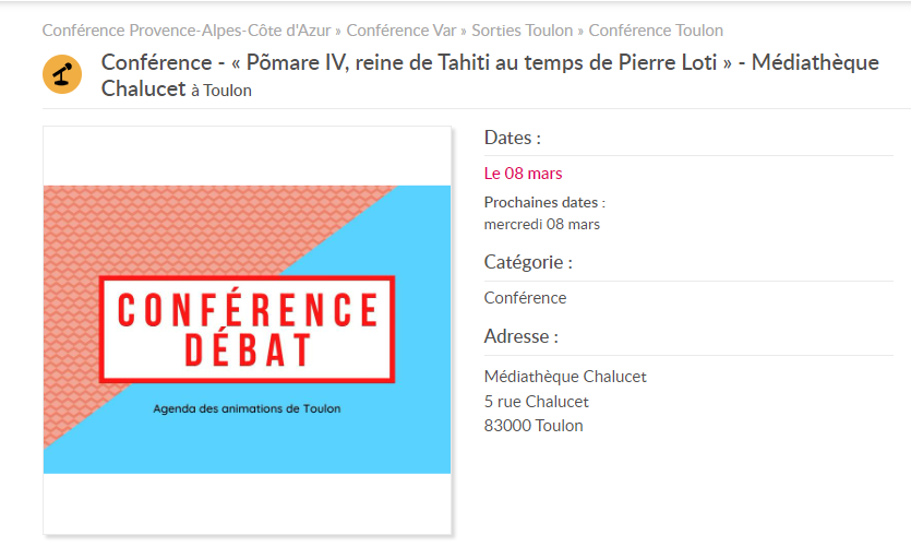 Conférence – « Pomaré IV, reine de Tahiti au temps de Pierre Loti » – Médiathèque de Chalucet à Toulon – 8 mars 2023 Posted on 9 août 2022 by AIAPL https://www.alentoor.fr/toulon/agenda/4107909-conference-pomare-iv-reine-de-tahiti-au-temps-de-pierre-loti-mediatheque-chalucet