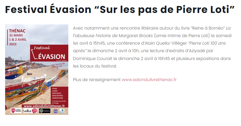 Découvrez le programme du salon et ce qui a trait à Pierre Loti : www.salondulivrethenac.fr