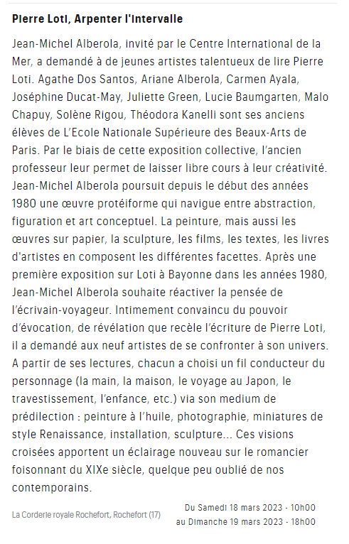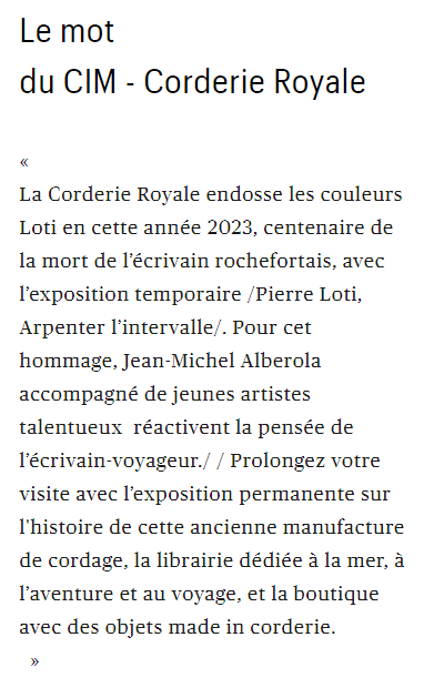 Pierre Loti au Centre International de la Mer – Corderie royale à Rochefort sur mer Posted on 2 mars 2023 by AIAPL https://sorties.telerama.fr/la-corderie-royale