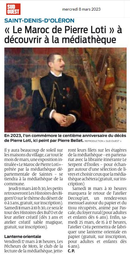 Saint-Denis-d’Oléron « Le Maroc de Pierre Loti » à découvrir à la médiathèque Posted on 8 mars 2023 by AIAPL