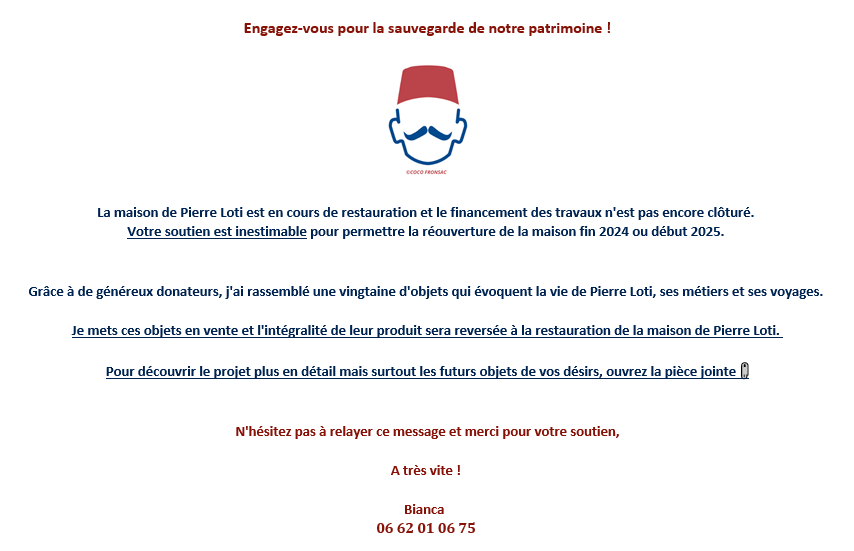 Vente au profit de la restauration de la Maison de Pierre Loti Posted on 8 mars 2023 by AIAPL Vous êtes nombreux à m’avoir demandé des nouvelles de ma vente caritative au profit de la restauration de la maison de Pierre Loti. Vous trouverez ci-dessous toutes les réponses à vos interrogations Vente Pierre Loti – Catalogue-V2