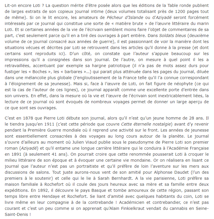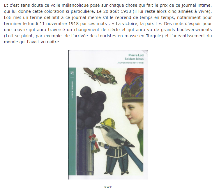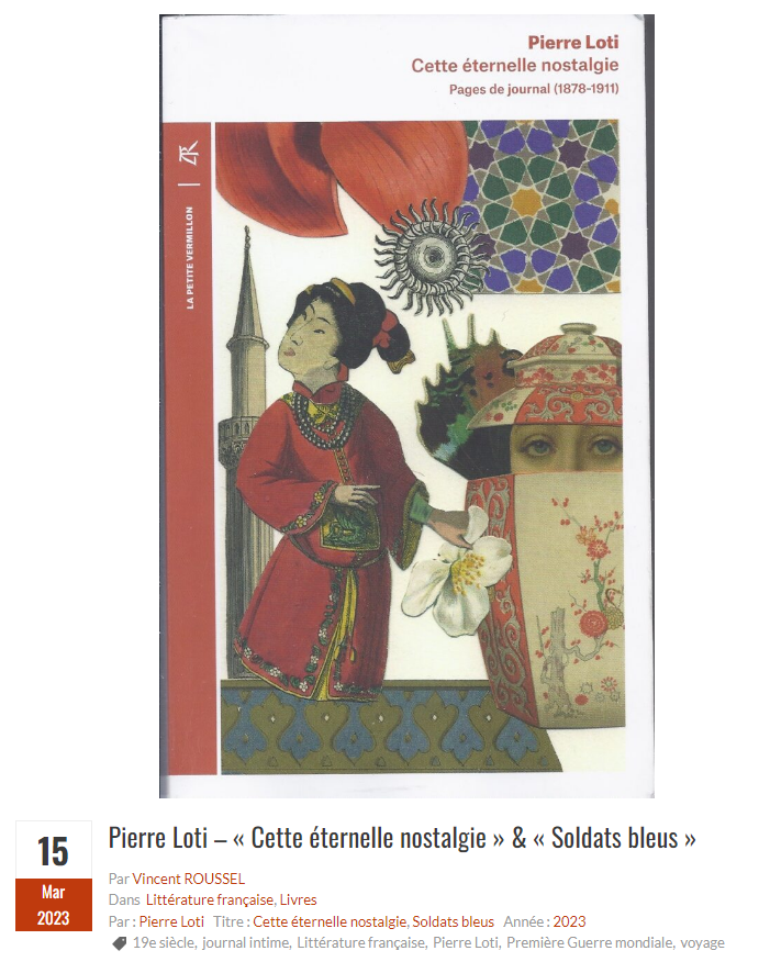 Pierre Loti – « Cette éternelle nostalgie » et « Soldats bleus » Posted on 17 mars 2023 by AIAPL https://www.culturopoing.com/livres/pierre-loti-cette-eternelle-nostalgie-soldats-bleus/20230315