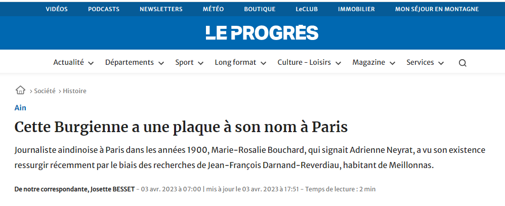 Cette Burgienne a une plaque à son nom à Paris Posted on 6 avril 2023 by AIAPL Lire l’article en cliquant sur ce lien https://www.leprogres.fr/culture-loisirs/2023/04/02/une-plaque-apposee-a-paris-en-l-honneur-d-une-journaliste-burgienne