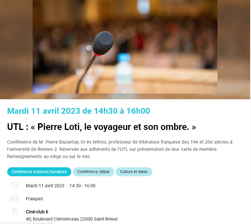 Conférence : « Pierre Loti, le voyageur et son ombre » le 11 avril 2023 à Rennes Posted on 6 août 2022 by AIAPL