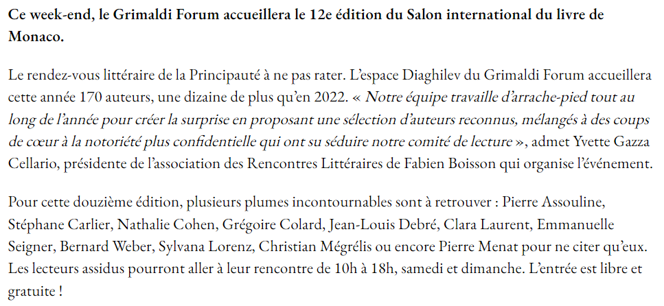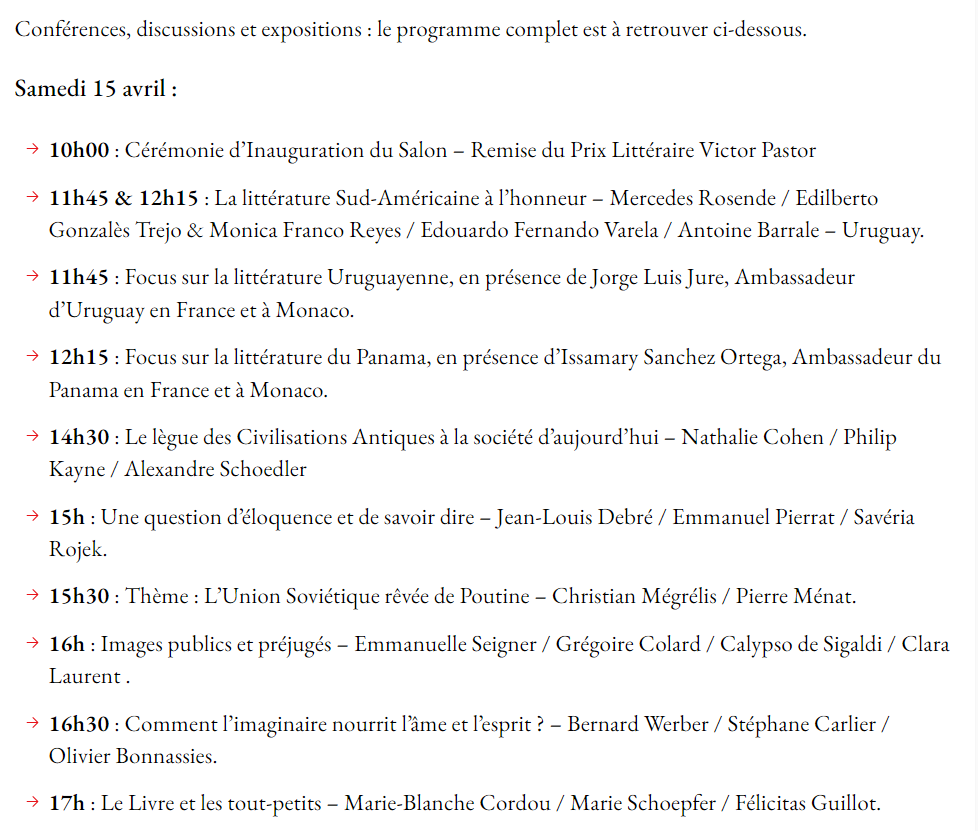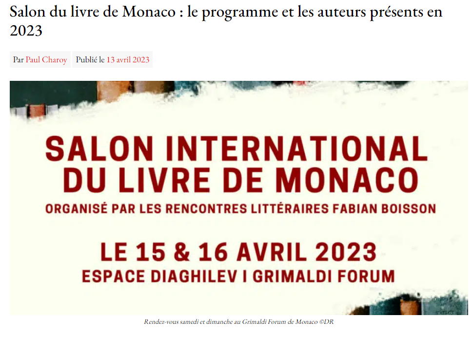 Salon international du livre de Monaco le 15 et 16 avril 2023 Posted on 13 avril 2023 by AIAPL https://www.monaco-tribune.com/2023/04/salon-du-livre-de-monaco-quel-programme-en-2023/