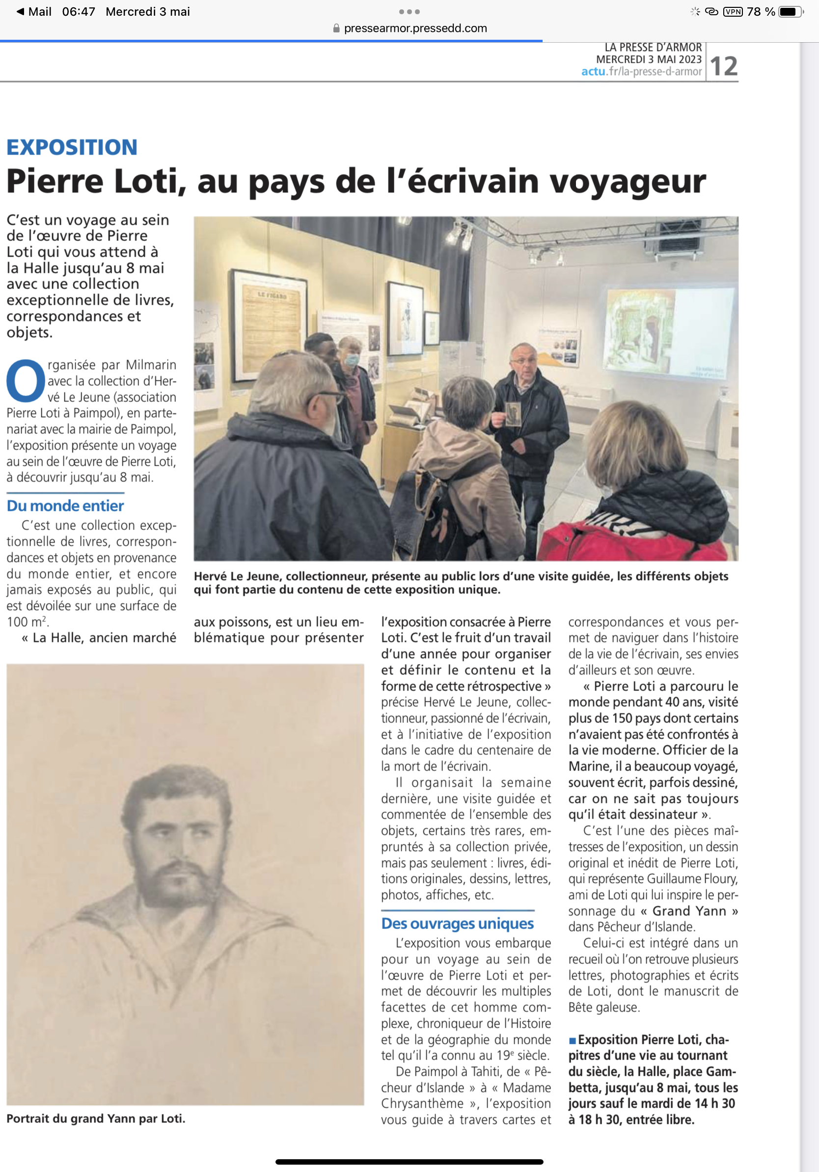 Exposition : Pierre Loti, au pays de l’écrivain voyageur Posted on 3 mai 2023 by AIAPL Le programme : https://www.milmarin.bzh/pierre-loti-2023/