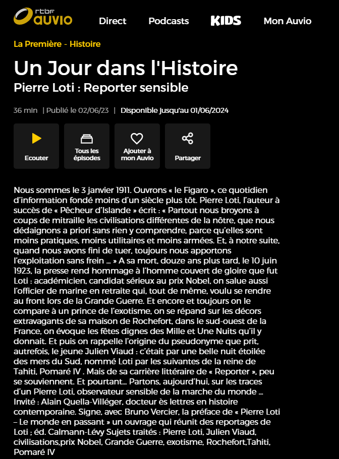 Un jour dans l’histoire, Pierre Loti : Reporter sensible Posted on 4 juin 2023 by AIAPL Cliquez sur le lien pour écouter l’émission https://auvio.rtbf.be/media/un-jour-dans-lhistoire-3043381