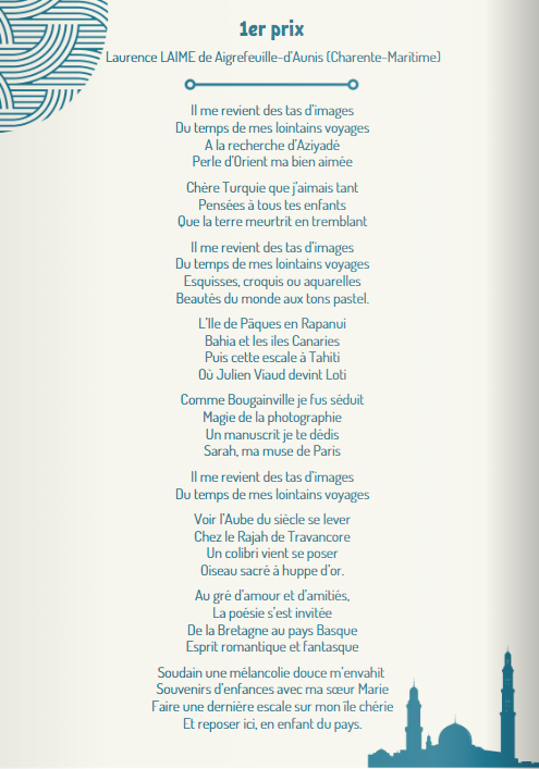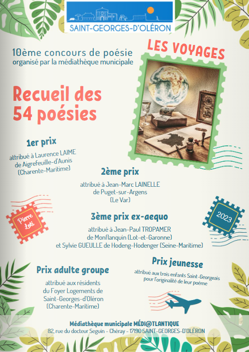 Saint-Georges-d’Oléron : dixième concours de poésie sur le thème des voyages, inscrit dans la programmation des « 100 ans de la disparition Pierre Loti ». Posted on 4 juin 2023 by AIAPL https://www.calameo.com/books/0010480184eca49885100