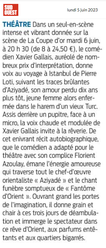 Voyage à Istanbul de Pierre Loti au théâtre de la Coupe d’or à Rochefort le 6 juin Posted on 6 juin 2023 by AIAPL