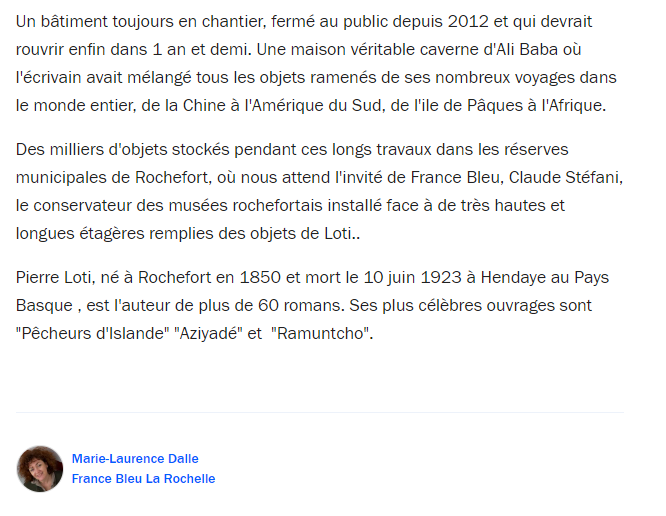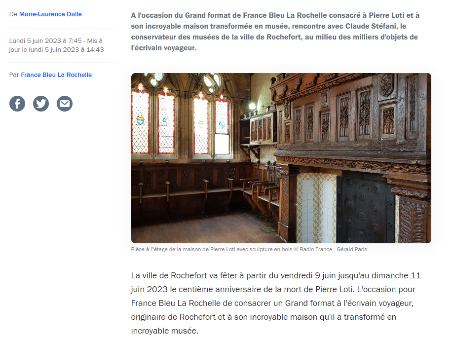 Les 4000 incroyables objets de la maison-musée de l’écrivain rochefortais Pierre Loti Posted on 6 juin 2023 by AIAPL Pour écouter, cliquez sur le lien : https://www.francebleu.fr/emissions/l-invite-de-france-bleu-la-rochelle/les-4-000-incroyables-objets-de-la-maison-musee-de-l-ecrivain-rochefortais-pierre-loti-4891233