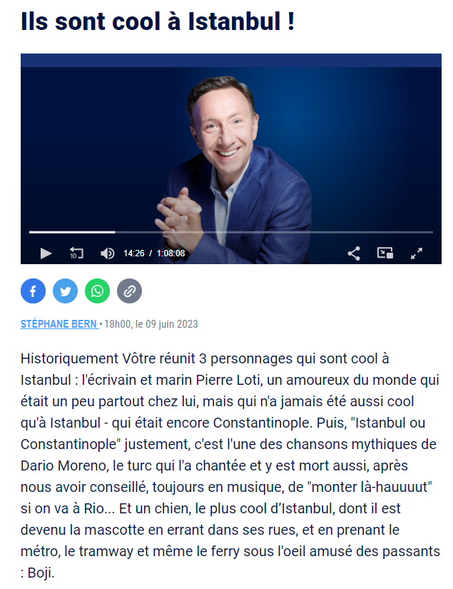 Ils sont cool à Istanbul Posted on 11 juin 2023 by AIAPL Cliquez pour écouter : https://www.europe1.fr/emissions/lequipee-sauvage/ils-sont-cool-a-istanbul-4187933