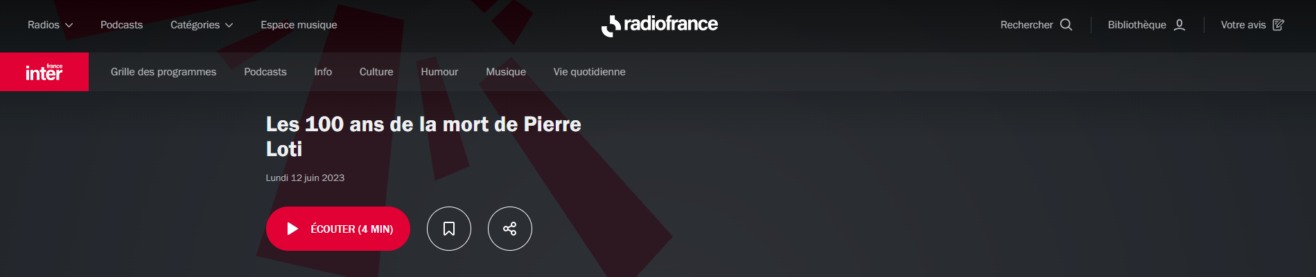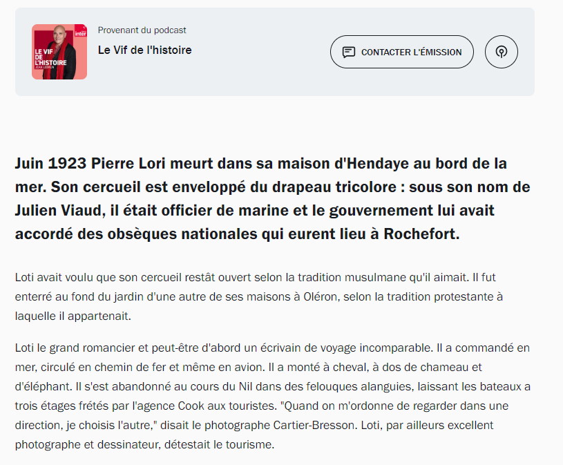 Les 100 ans de la mort de Pierre Loti Posted on 12 juin 2023 by AIAPL Cliquez sur ce lien pour écouter : https://www.radiofrance.fr/franceinter/podcasts/le-vif-de-l-histoire/13h54-le-vif-de-l-histoire-du-lundi-12-juin-2023-3893952