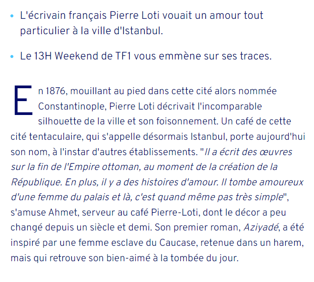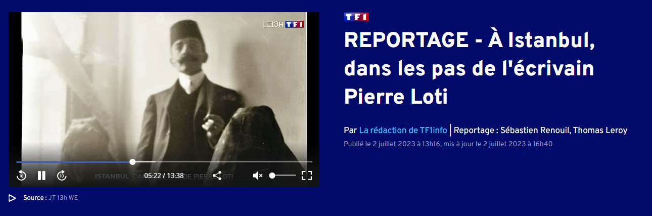 Reportage – à Istanbul, dans les pas de l’écrivain Pierre Loti Posted on 2 juillet 2023 by AIAPL cliquant sur le lien : https://www.tf1info.fr/voyages/reportage-video-tf1-a-istanbul-dans-les-pas-de-l-ecrivain-pierre-loti-2262333.html