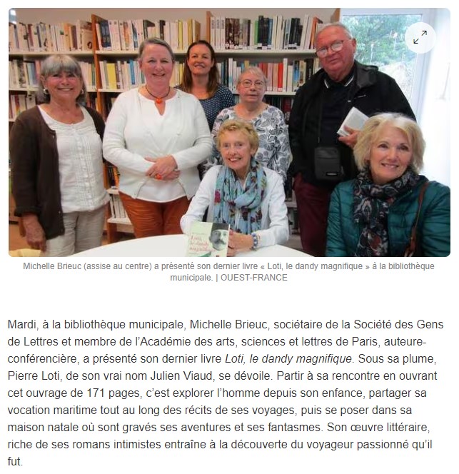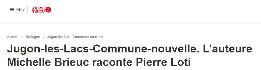 Jugon-les-Lacs-Commune-nouvelle. L’auteure Michelle Brieuc raconte Pierre Loti Posted on 11 juillet 2023 by AIAPL https://www.ouest-france.fr/bretagne/jugon-les-lacs-commune-nouvelle-22270/lauteure-michelle-brieuc-raconte-pierre-loti-dddb6478-1bd6-11ee-9817-eaa28518a142