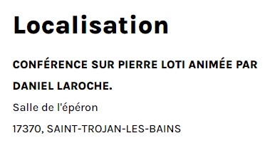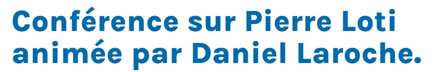 Conférence sur Pierre Loti animée par Daniel Laroche le 22 septembre 2023 Posted on 5 juillet 2022 by AIAPL https://www.ile-oleron-marennes.com/agenda-des-manifestations/conference-sur-pierre-loti-animee-par-daniel-laroche