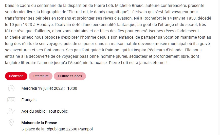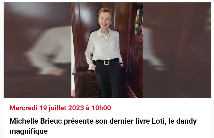 Paimpol : Michelle Brieuc présente son dernier livre Loti, le dandy magnifique, le 19 juillet 2023 Posted on 16 juillet 2023 by AIAPL https://infolocale.ouest-france.fr/associations/sans-culture-litterature-122672/evenement-paimpol-michelle-brieuc-presente-son-dernier-livre-loti-le-dandy-magnifique-7959535?int_emplacement=of_locale_paimpol_22162&int_medium=lien&int_campaign=infolocale&int_content=event&int_term=7959535