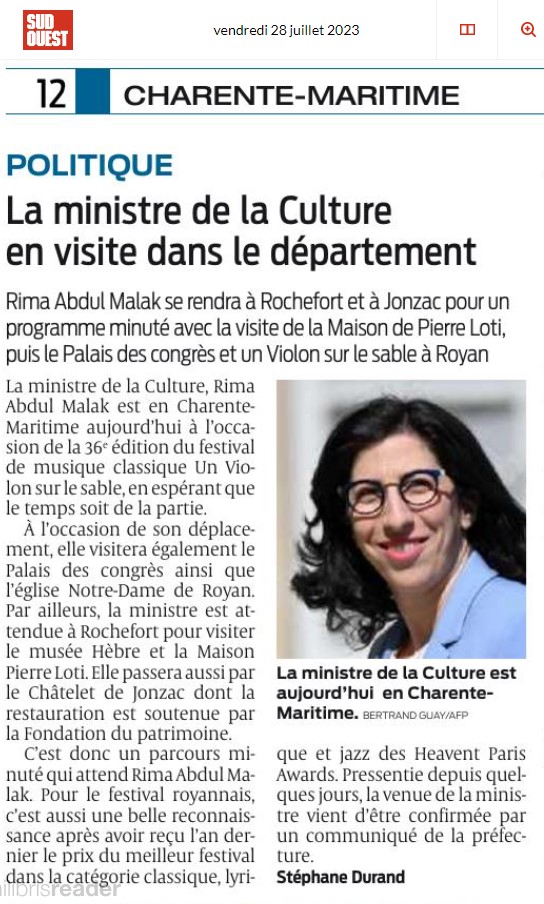 Charente-Maritime : La ministre de la Culture en visite dans le département. Posted on 28 juillet 2023 by AIAPL