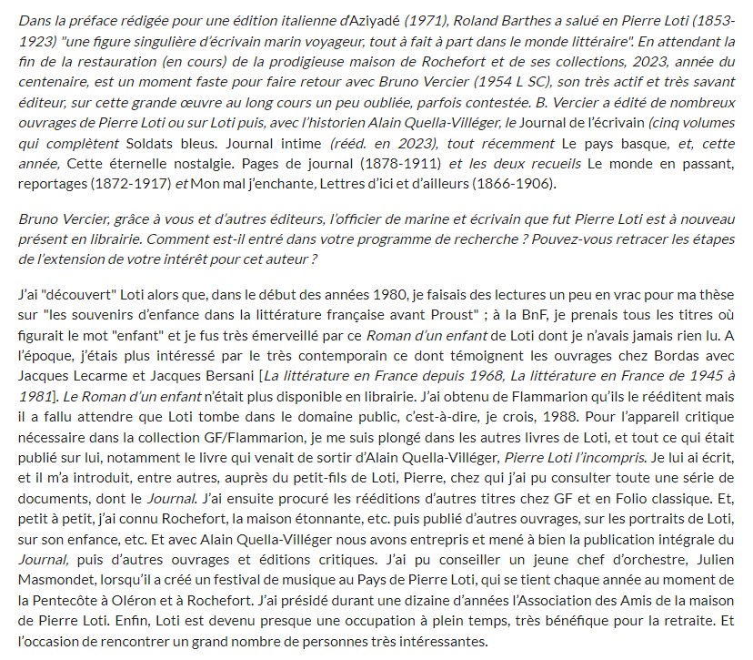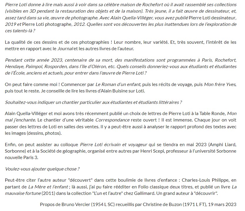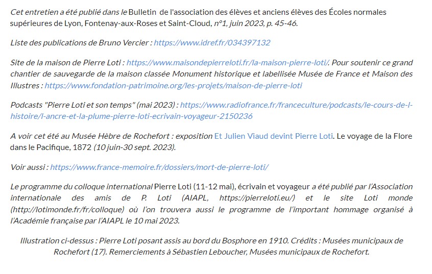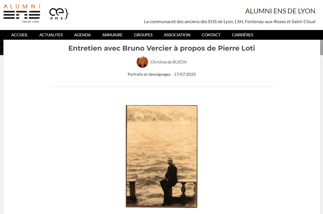 ALUMNI ENS de LYON : Entretien avec Bruno Vercier à propos de Pierre Loti Posted on 28 juillet 2023 by AIAPL Entretien avec Bruno Vercier à propos de Pierre Loti | Alumni ENS de Lyon – La communauté des anciens des ENS de Lyon, LSH, Fontenay-aux-Roses et Saint-Cloud (ens-lyon.fr)